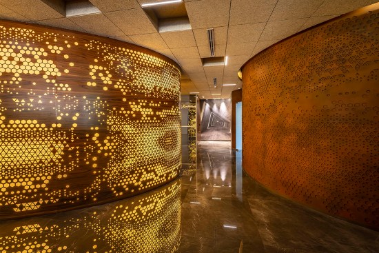 Done in concrete, a dramatic and sweeping cantilevered stairway spirals asymmetrically through the space, connecting all three levels of the office. Railing on both sides of this gray staircase are perforated, echoing details from the individual workstations in the office space and allowing for the passage of natural light. The stairway’s graceful curves create an easy circulation pathway, connecting a vibrant workplace.