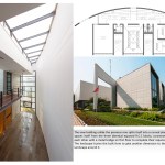 The new building unlike the previous one splits itself into a curved plane and spaces itself from the three identical exposed R.C.C blocks, connected with each other with a metal bridge on first floor to complete their requirements. The landscape buries the built form to give another dimension to the usual landscape around it.
