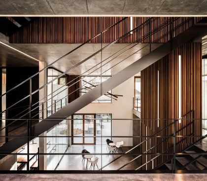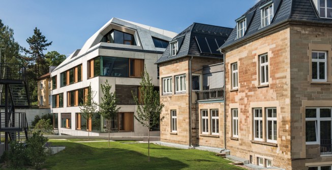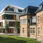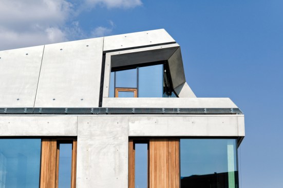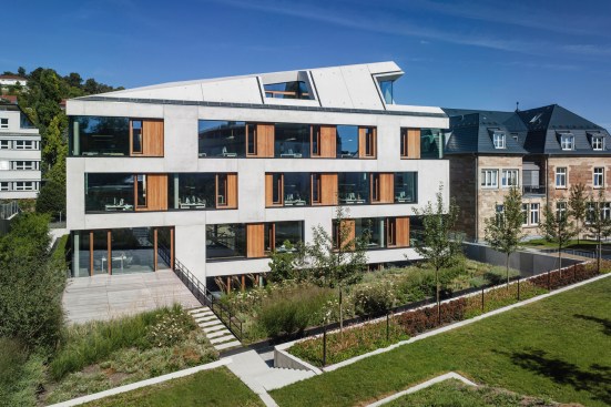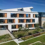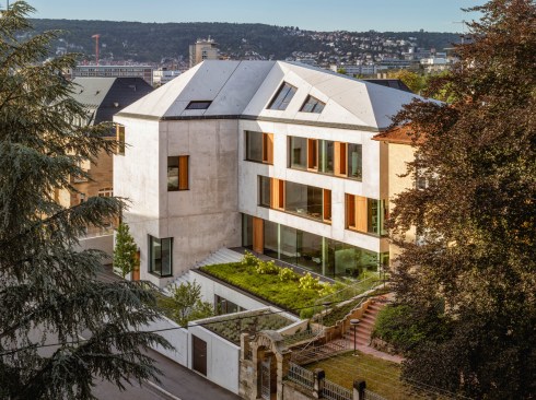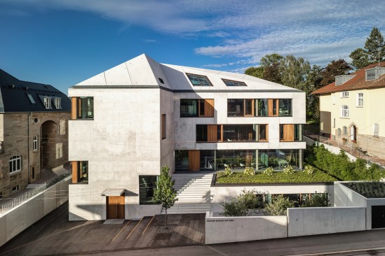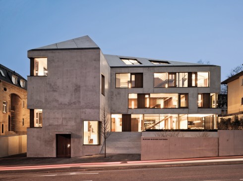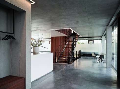 This building is simple, but striking. The rustic charm of exposed concrete – a double-layered concrete façade with cavity insulation – plays off against the ethereal transparency of broad windows. Elements of Sipo mahogany, strategically placed, give the façade depth; and the clean lines add a sense of order and dynamics. The office building consists of three full floors, a garden, a roof and cellar. The simplicity of the interior design, with its sandblasted and exposed concrete surfaces as well as its cement screed flooring, works in harmony with the outer appearance. Open floors, which nevertheless have clearly defined spaces, make the boundaries between working areas disappear.Certified with Gold by the DGNB (German Sustainable Building Council), the building incorporates a broad range of sustainability measures. Amongst them are the prevention of toxic materials or the reduction of the life circle costs. The intermingling of ecology and economy also shows within the fusion of building construction and technology which includes a thermally comfortable room climate as much as energy saving at the maximum. The lighting concept which relies on daylight and LED technology belongs as much to the measures as do air hygiene and aesthetical aspects.