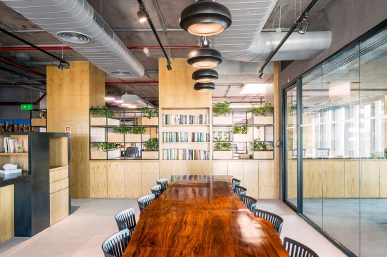 The interiors of the office move on from being static to being networked and tentacled. The design creates a concerted and agile environment resulting in an open and heterogenous executive space. A contrasting palette of warm and cold materials have been used to reflect the robust nature of the company’s work profile while giving a rugged yet elite feel to the space. An eclectic mix of corporate furniture with natural wood live-edged tables and signature pieces create a high-impact environment. The reception lends to the identity of the office space, with a symbolic free-flowing entrance foyer that is emblematic of the company and its brand identity. Inspired by the company’s logo, the reception desk is a sinewy S-shaped form that morphs into the visitors’ seating area.