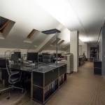 The interior created for this corporate office is laconic, male-oriented, reserved, and respectable, yet original and vivid enough. The colour palette chosen for this interior is calm and moderate – grey, beige, silver, black and white. There are a lot of glass surfaces and walls, as well as a glazed roof and many dormer-windows that provide a lot of natural daylight and a feeling of wide space in the room.