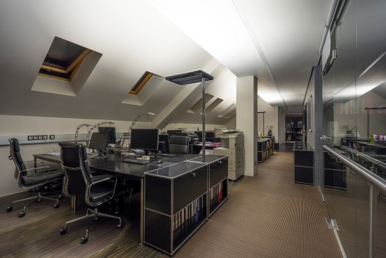 Most of the furniture and decoration elements were produced specially for this project according to Katz’s sketches. Some well-known furniture brands – Herman Miller, Poltrona Frau, Armani Casa – have also been used in the furnishing of the office.