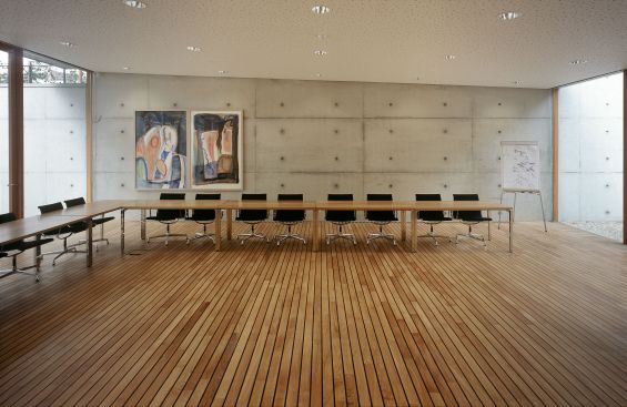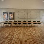 Mecanoo’s integrated approach to the project seamlessly interweaves interior, extension and renovation. Daylight reaches the underground extension via two courtyards, creating a light, comfortable working environment. The north wall is made of smooth concrete that bounces sunlight into the spaces, while the south wall is lined with a forty-metre-long timber cabinet. From the ground level in the main block, oak ship-deck flooring continues down the stairs into the lower spaces.