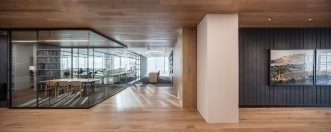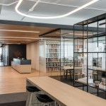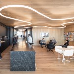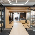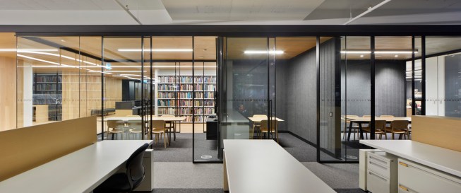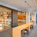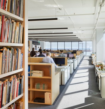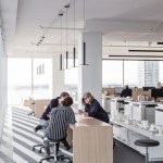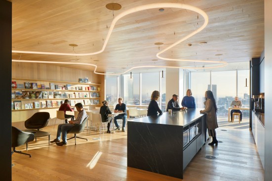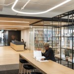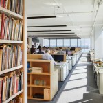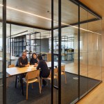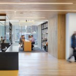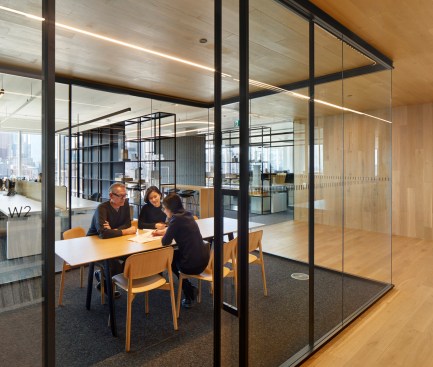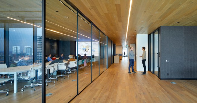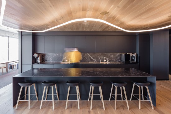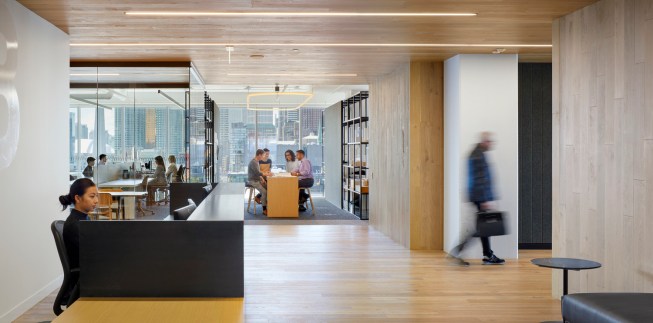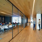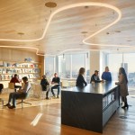 KPMB’s office includes four large open work zones to encourage teamwork and brainstorming, centered around a white oak-lined central pavilion offering more meeting and gathering space, including a staff lounge and town hall.