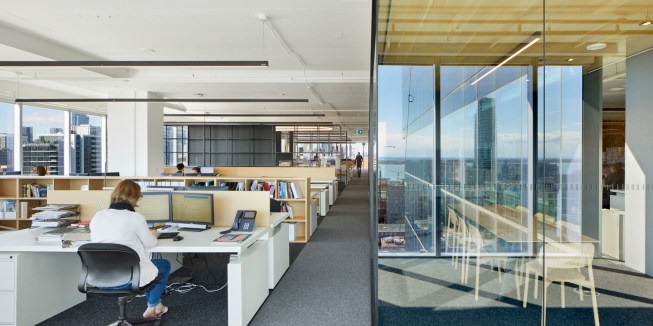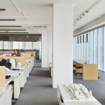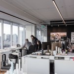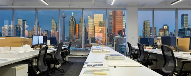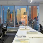 In the work “lofts”, the tower concrete is left exposed, finished with sustainable carpet tile and pin-up surfaces (recycled plastic), and various sized meeting rooms offer views in all directions to Toronto and the lake.