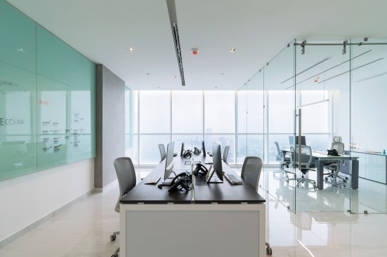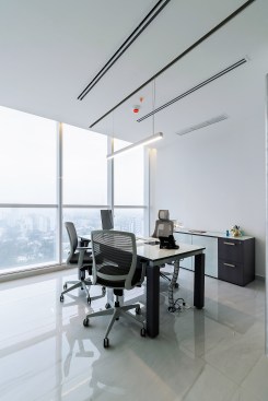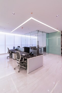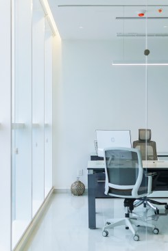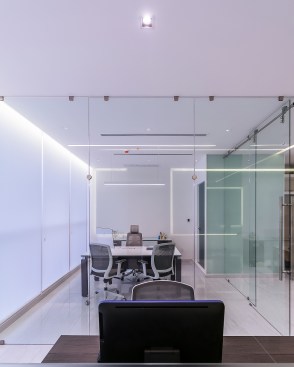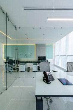Un espacio que alberga una oficina privada de gerencia y un espacio abierto para el área de trabajo. La transparencia es parte clave en este proyecto, la oficina privada se divide con elementos de cristal así para no fragmentar el espacio de ninguna manera.