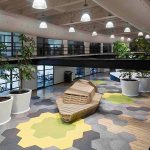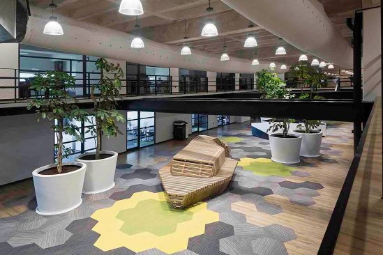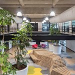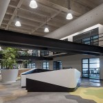 The floors were softened with a combination of gray carpet and vinyl wood type floor that, that also give acoustic absorption much needed in intense traffic spaces. The apparent concrete es the base of the finishes palette and color is present with a vibrant alternative to stand out sections on the carpet and some furniture.