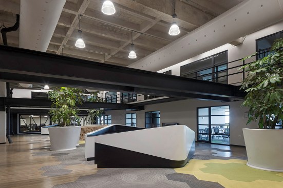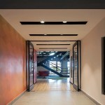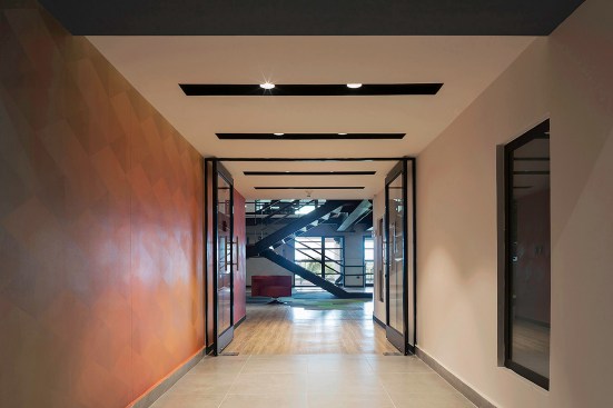With the target of reaching a dynamic and joyful environment the double height central space was fully exploited ending with the vertical circulation that takes users and visitors to the different areas located on the second level. It was decided to leave apparent the structure and slabs, solving the mezzanine with a mate black metallic structure that defines the contrast between the concrete and the envelope.