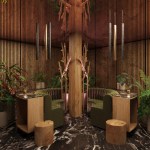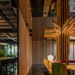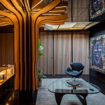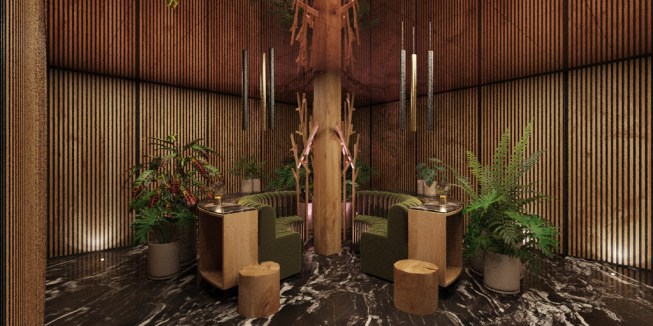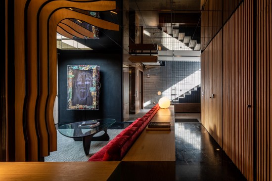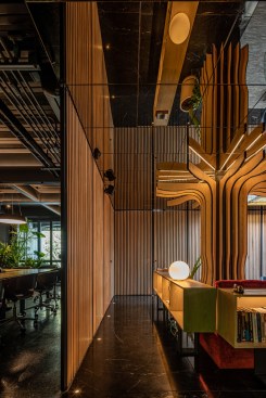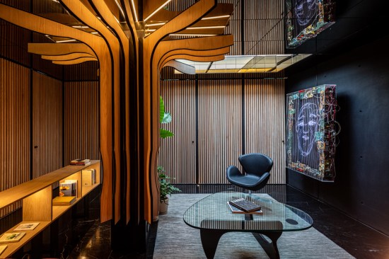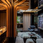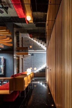 Lambrines made from blacksmith solera frames frame this first reception area, where there is a wooden tree in a serial plan as a central attraction. This is accompanied by a red booth placed on a Monterrey marble floor, and a video wall on the access wall where special brand content will be played. Due to the heights within the space, a bronze-colored mirror ceiling was placed in order to expand and change the spatiality of the place.