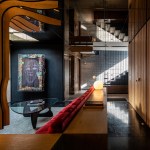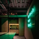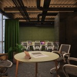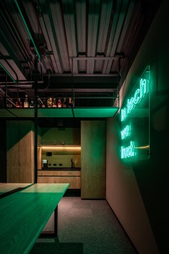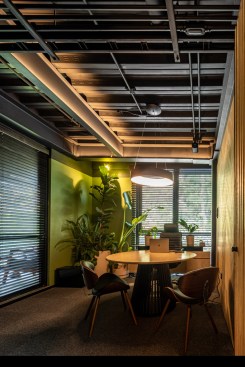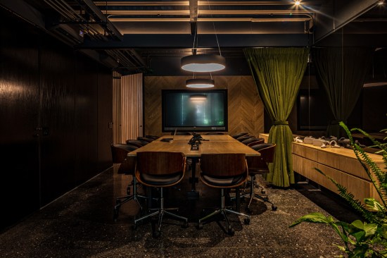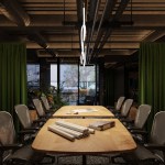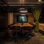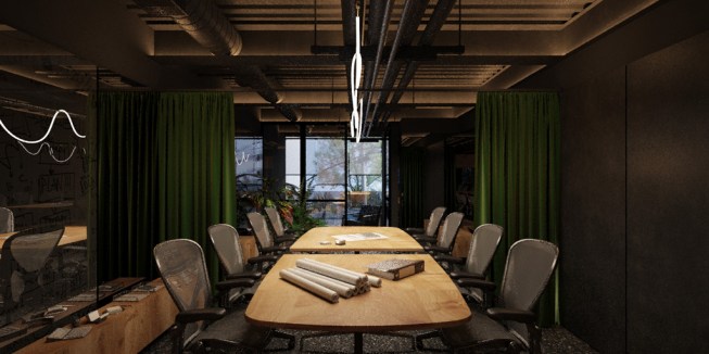 Entering the office, two work areas were designed. This first one is interconnected with a private one, which house work tables and a central table for the use of the space. However, by means of an olive green curtain, the zones can be divided when the client decides. Both spaces use oak wood furniture, and preserve the building’s pre-existing materials: apparent concrete floors and the ceiling with the apparent installations painted in black.