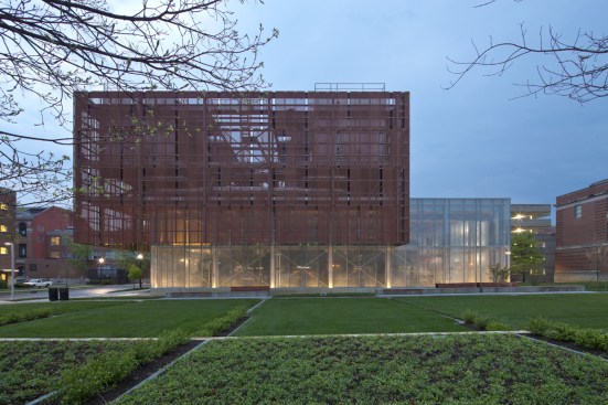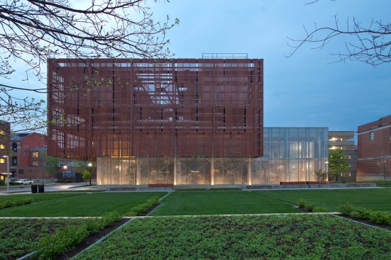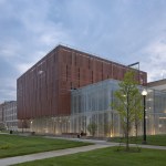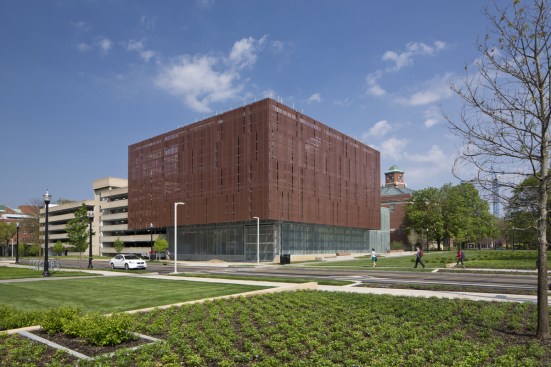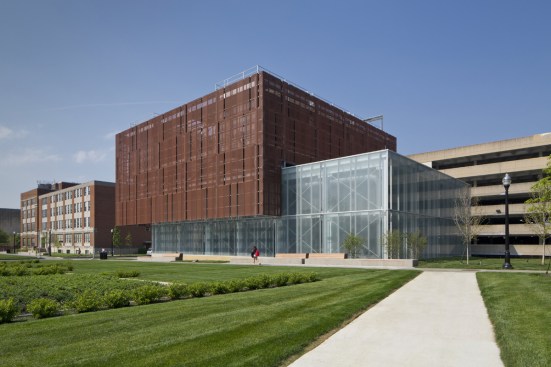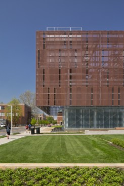 On a prominent site between campus and city, this critically important large infrastructure facility fits comfortably among its smaller academic neighbors, preserves an important green space, and frames the gateway for a new campus entry.