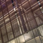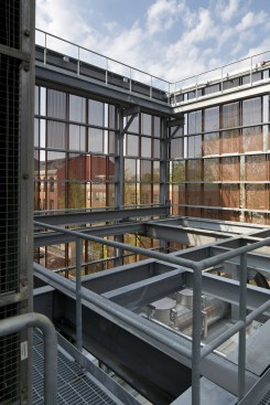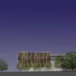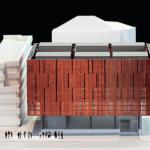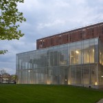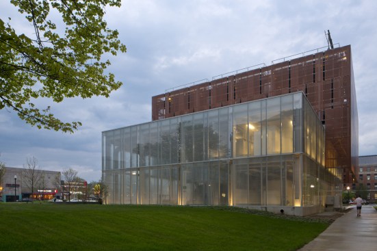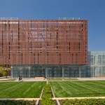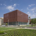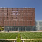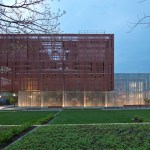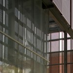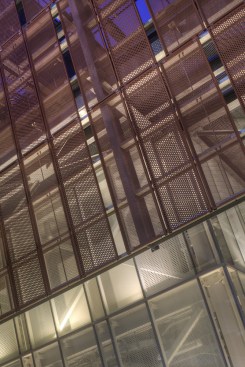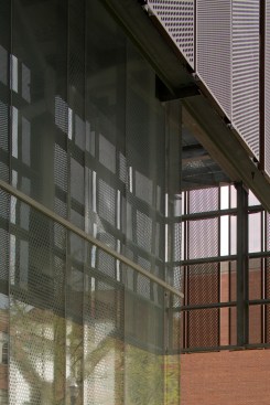 The large scale of the structure is modulated by its composition of two offset volumes: a lower, glazed rectangular volume with semi-transparent views from the interior looking out, and an upper lifted square volume with perforated metal walls of copper colored, coated aluminum that provides a cost-effective water cooling tower enclosure.