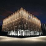 Both volumes are gently illuminated at night to provide site lighting for the surrounding pedestrian zones and to continue the dialogue between the forms and their contrasting materials. The glowing crystalline lower volume is illuminated from the inside, while the glittering metallic volume above is illuminated with a halo of projecting lights at its upper edge.