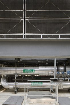 Designed to support the densely packed equipment layout, both the upper and lower volumes respond to unique engineering requirements—the upper screened volume contains the cooling towers, and the lower houses the chillers. To minimize the building mass, a full basement contains pumping equipment.