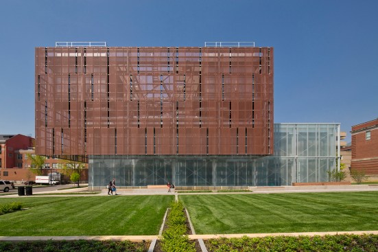 The upper screen wall is designed with two perforation densities, and together with narrow open slots achieve the average 50% open area needed for equipment ventilation. The perforated copper-colored aluminum enclosure is a modern companion to the brick used widely throughout the campus.