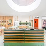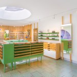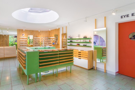 This eyewear store takes its merchandise as inspiration and makes clear its function to the street traffic nearby. Large circular openings on the exterior with oxidized iron frames act as signage. This graphic treatment of the exterior is also functional, bringing in natural light to the interior and allowing outsiders passing by to window shop. A large interior “oculus” skylight combines with the exterior openings to bring a bold interplay of light and form to the interior of this small boutique.