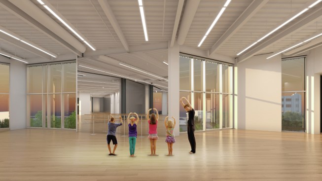 The new 53,916-square-foot, four-story building with a luminous facade – designed by Oklahoma City firm Rand Elliott Architects – captures aspects of the state’s ever-changing weather conditions and reflects and embraces the dramatic changes in light and sky that characterize the local landscape. In addition to the 8,000 square feet of galleries for visual art, the new building includes a flexible theater space that seats 200, a dance studio and nine classroom studios. The building is the centerpiece of the purpose-built 4.6-acre Oklahoma Contemporary campus, which will become a cultural gateway to downtown Oklahoma City. The grounds also include a renovated 9,839 square-foot historic warehouse (to house studios for ceramics and fiber as well as metal and wood sculpture) and a three-block arts park, providing space for outdoor exhibitions, education programs and public performances.