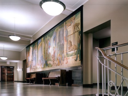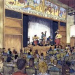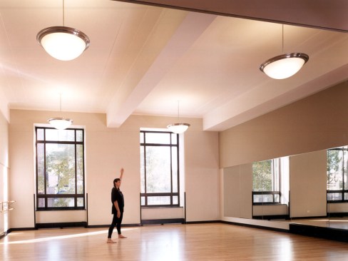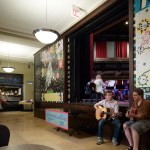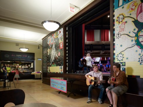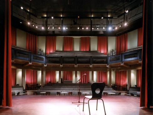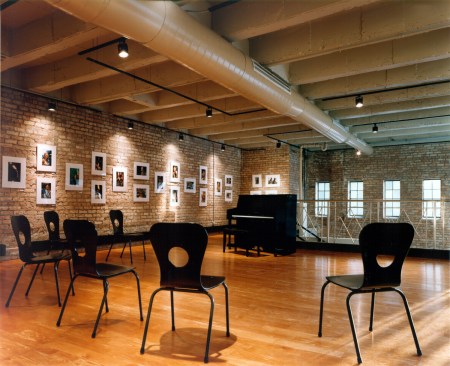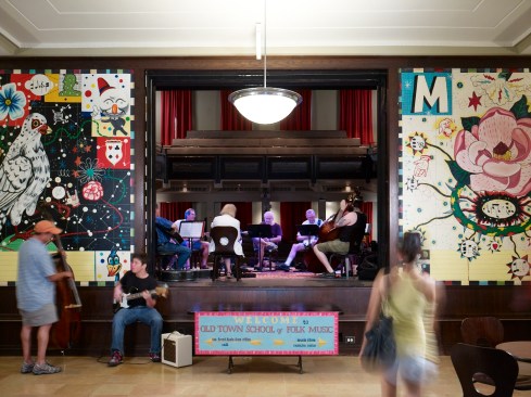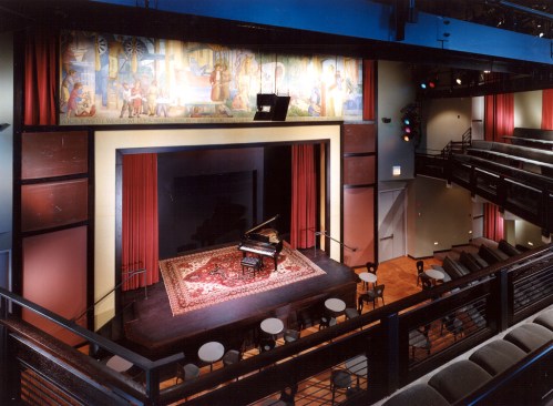 With the help of Joni Mitchell and Peter Yarrow, the Old Town School of Folk Music opened their new home in September of 1998. The new facility is the result of an adaptive reuse project that converted a 1929 Chicago library designed by Pierre Blouke. The building was abandoned in 1986 when the library relocated to a new facility nearby. Comprising approximately 43,000sf of space, the music school includes a 425-seat performance hall, a retail shop (“Different Strummer”), a box office, cafe, a gallery, and numerous classrooms. The centerpiece of the facility is the iconoclastic performance hall. Instead of constructing a traditional auditorium that would be seldom used except for performances, the school opted for a space that would remain a social center throughout a typical day. The hall, developed as a variation on a cabaret, is outfitted with a “see-through” stage, numerous windows, loose seating and tables, and is served by a walk-up café. Located in a half-drum shaped space formerly occupied by four floors of book stacks, the hall contains two levels of raked seating that wrap around a center thrust stage. Instead of occupying a peripheral location like most venues, the stage was instead located prominently in the center of the building. In fact, with a backstage wall formed by two large sliding doors, the stage and the hall become the focal points of the main entry lobby. Because the sliding doors are kept open except for performances, visitors entering the facility see directly into the hall, vicariously enjoying a point of view similar to that of an on-stage performer. Twenty-six teaching spaces are located throughout the facility. The smallest spaces, located under the perimeter of the performance hall, are a group of 10 private teaching studios. Each studio is daylit by a restored areaway window and is isolated from neighboring studios with redundant walls and ceilings. Three heavily fortified classrooms are located on the lower level and are designed for amplified and percussive instruments. The rooms are each walled with combination masonry and gypsum board partitions and are provided with acoustically absorptive bass traps.