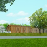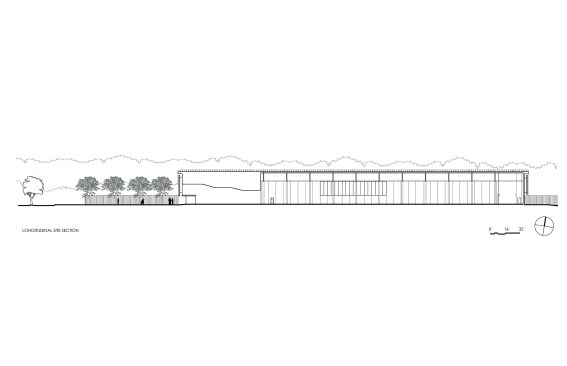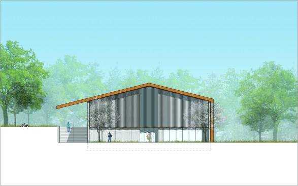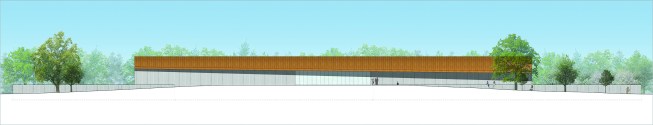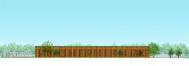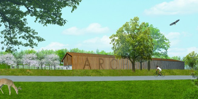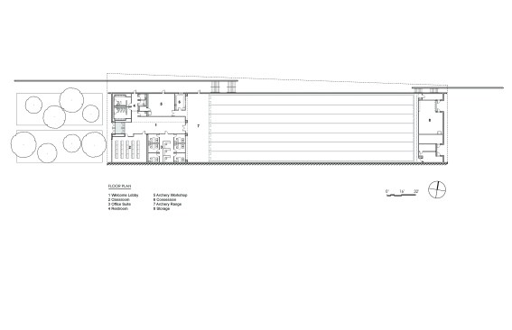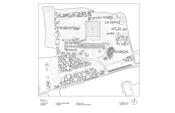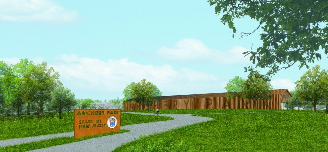 Sitting in a bucolic sloping meadow of native tall grasses and stands of black walnuts, Archery Park is a rusting rural shed nestled within old growth landscape of northwest New Jersey to house an indoor 90,000 square foot Olympic Archery training facility. The Division of Fish and Wildlife for the State of New Jersey intends to build a training facility for Olympic Archery, one of a few dedicated east coast facilities to support interest in the sport of archery. To mitigate its large 70 meter footprint on this natural site, the building has been carefully integrated with the topography. Exposed concrete walls of the indoor range retain the sloping land and create a level meadow to the north for an outdoor competition range and a flat grade below for the indoor range. The natural slope of the site gently rolls around the indoor range and establishes a landscaped entry court of river birch trees and native grasses. Rough-hewn concrete, regional field stone and corten steel panels harmoniously unite the structure to its natural surroundings. The corten roof overhang, screens and panels allow the sun, over the course of the day, to cast dramatic shadows on the building thus further integrating the structure to its natural condition. Perforated openings in the rusting steel panels sign the function of the building from the adjacent roadway. In addition to the Olympic-sized indoor archery training range, the facility houses offices, classrooms, exhibition lobby, concession and support facilities for archery and hunter education.