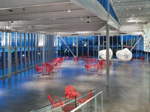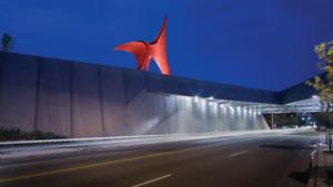 One building that provides such light is the park’s PACCAR Pavilion, an 18,000-square-foot glass and steel structure located at the park’s main entrance that houses exhibition and event space, areas for educational programming, underground parking, a bookshop, and a cafĂ©. Designed as an extension of the z-shaped landform, the pavilion—which includes a series of cantilevered roofs and stepped terraces—links the indoor and outdoor spaces via folded stainless steel and mirrored frit glass that capture the reflections of the surrounding city and landscape.