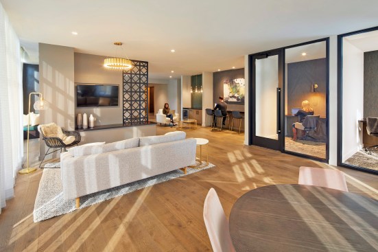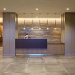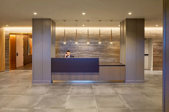 A range of warm deep-tone grays combine with a mix of metal finishes to anchor this interior design aesthetic and are elegantly punctuated by a dramatic stone wall upon entry. Cove lighting is used throughout to highlight natural stone accents and custom millwork. The clubroom embodies an edgy, cool atmosphere with dark finishes and gold accents. A hospitality bar is nicely paired with adjacent banquette seating while workpods, gathering tables, and a touchdown counter provide flexibility for residents working from home. A secure parking garage, complete with bike storage, is accessed through the main lobby and provides a below grade connection to the newly constructed City of Quincy garage, allowing residents a private connection to their parking space. Located five minutes from the Quincy Center MBTA station, the transit-oriented development offers residents convenient access to local shops and restaurants.