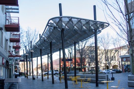 Banker Wire mesh forms a shade structure that serves as the centerpiece for the plaza, and meaningfully evokes Greenville’s history. Greenville was previously known as the “textile center of the world,” and Civitas, designer of ONE City Plaza, wanted to pay homage to the city’s past. That desire led them to consider metal fabric for the shade structure, and they selected Banker Wire wire mesh based on the company’s combination of quality, cost-efficiency and design expertise. The Banker Wire S-12 pattern used has raised facets that draw attention to its woven composition in a nod to the textile industry.