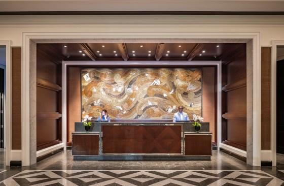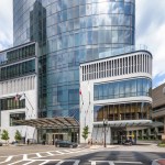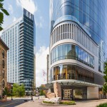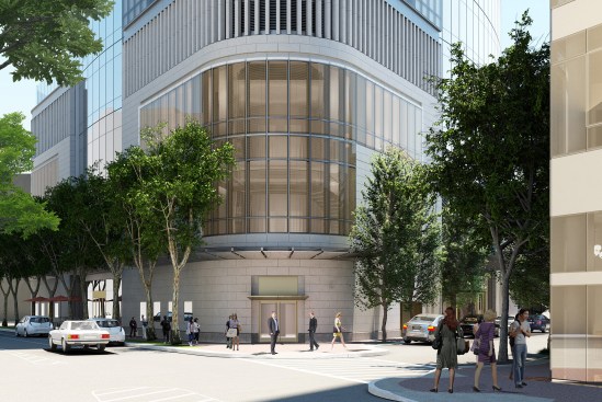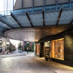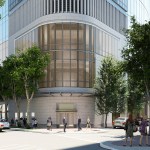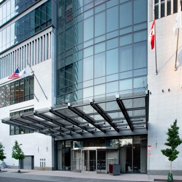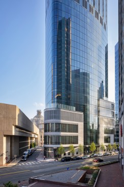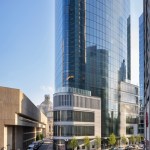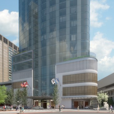 Reaching out to the three corners of the triangular site and rising to the height of the nearby townhouses, the podium makes the 61-story tower a good neighbor. With expanses of warm gray granite, punctuated by clear glass shaded by wood louvers, the building presents an open and welcoming demeanor at ground level. Despite their distinct character and materiality, tower and podium are intimately engaged: sections of the tower’s curtain wall descend through the podium. On one face, this break in the podium frames the hotel entry.