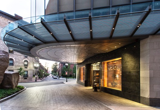 A small triangular park opposite the hotel entry, where St. Germain Street meets the tower, serves as a mediating space that further integrates the building with the surrounding neighborhood.