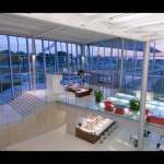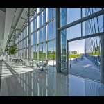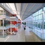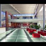 This project provides new office space in remodeled and new construction adjacent to an assembly plant for a furniture and interior products manufacturer. The goal was to transform the existing space into an interactive environment for clients and staff while maintaining as much of the existing structure as possible. A new three-story-high work-showroom space has been layered on to the existing three-story structural frame. This space acts as a product demonstration lab, while also providing for client engagement and mock-up areas. Vertical tower elements organize the different work zones by projecting into the three-story space. These towers provide areas for informal collaboration and designate centers of excellence for specialty services and products to help tell the story of the client’s business. Variations in tones of red, the client’s color, allow the towers to act as strong modulating elements within the work-showroom space. An underfloor air system over the existing structure increases energy efficiency, provides flexibility, and allows for ceiling heights which maximize light penetration. The office space in this refurbished structure is a reconfigurable chassis based on work types organized into “dynamic” (open office), “temporal” (rooms of movable partitions) and “place” (permanent infrastructure) zones.