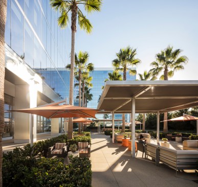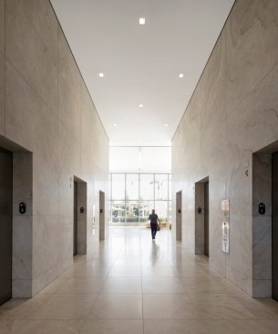 Arriving at the main lobby via the motor court drop-off or by foot through a landscaped courtyard, occupants and visitors can easily find their way to the appropriate lift within the central elevator lobby. The state-of-the-art, 1,000-foot-per-minute elevator system uses destination-dispatch technology to shuttle passengers efficiently to their intended floors. Ground-level amenities include a fitness center and full-service café accessible from the main lobby. The landscaped grounds feature a large central garden courtyard containing several shaded workspaces with soft seating and Wi-Fi connections.