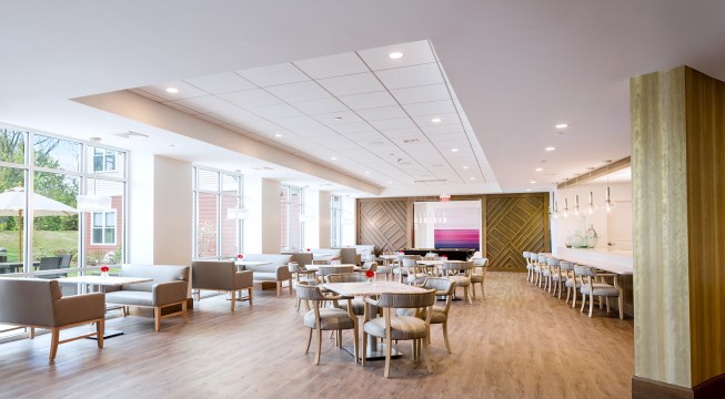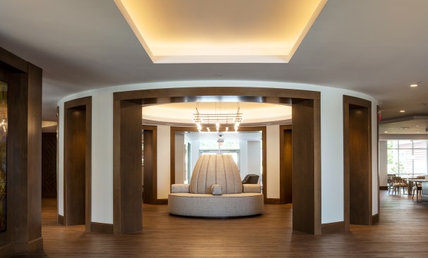 One Wingate Way is the third and final phase of design for this property – creating a full post-acute continuum of care – from independent and assisted living to skilled nursing. This new community emphasizes wellness, socialization and active engagement for independent seniors through specific design configurations allowing the residents to visually experience five distinct programmatic spaces upon entering the lobby. The open design concept creates a pedestrian-friendly campus, linking interior spaces with exterior seating, sculpture gardens and green spaces.
