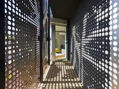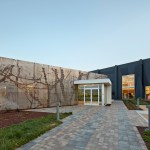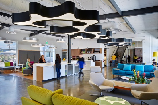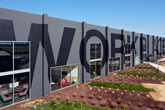 The project plays a key role in the regeneration of an industrial area in the City of Santa Clara. Because the site acts as an intersection of public transit—planes, trains, and automobiles—it was identified by the city as a gateway to Santa Clara. The new façade boasts a 22-foot-tall supergraphic of the company’s name along the warehouse to establish a strong visual brand identity, breathe new life into the buildings, and beautify the neighborhood. A large tree, dominating the front landscape, is reflected in the perforated metal screen that wraps the building entrance. Large openings maximize natural light penetration into the building, and connect the interior activity to the newly landscaped spaces at the street edge. The spaces provide a multi-functional indoor/outdoor environment to offer additional meeting and workspaces that leverage California’s climate.
