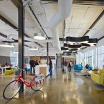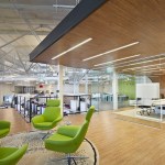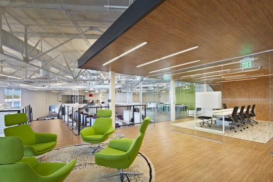 The architects planned for longevity and flexibility by future-proofing the open office through the installation of a raised floor system for easy furniture reconfiguration. Interior offices and small meeting rooms were constructed using a re-usable and demountable partition system that allows for structurally isolated rooms to be created without connecting to the ceiling. Minimal colors and patterns allow easy interchangeability to reduce waste as furniture trends change.