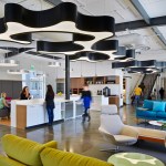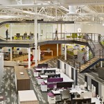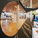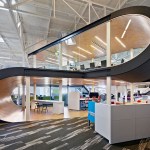 One Workplace hired Blitz to combine an existing stand-alone, mid-century office building and warehouse into a 35,000-square-foot space accommodating an office, and showroom for the Bay Area workplace furniture dealers. As an adaptive reuse project, the company’s headquarters invigorates a previously overlooked industrial area and gives it new life. A highlight of the interiors is the central form of two stacked boomerang-like C-shaped structures—representing “collaboration” and “creativity”—that house an elevated conference room and observation platform for a bird’s-eye view of systems solutions. The boomerang concept also shapes the user experience, which assures that customers are guided through the entire showroom, stopping at a series of mapped touch points showcasing a variety of furniture vignettes. The meandering path ultimately brings customers back (“boomerangs them”) to the front of the showroom. The installation of mobile and flexible work systems improves employee effectiveness across all parts of the business, while sustainable features provide energy efficiency throughout the building.