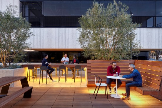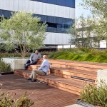OPEN is an office park development with three existing three-story office buildings located on a podium deck with parking below. HLW’s Los Angeles studio was asked to redesign the main courtyard, building interior courtyards, add a new coffee kiosk to the main courtyard, and reprogram a former café space into a tenant lounge located below the main podium.