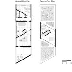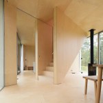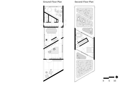 The stair leading to the second floor is equally simple, made of the same plywood as the interior enclosure; its triangular volume echoes the spatial arrangement of the plan. The second story, smaller than the first, contains the master bedroom and bathroom framed by a green roof on two sides.