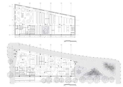 The ground floor is totally permeable and it is intended as an urban permeable plaza: a place that acts as an extension of the city. The boundary between the internal and external space dissolves, creating a continuous space. At the ground floor the building follows the existing topography becoming a terraced space that is the core of the building: an informal place for study and relax, accessible to everyone. The upper floor houses, on the other hand, all the most reserved and silent activities of the building, ideal to house the functions that characterize a traditional library. The indirect natural light comes from an internal patio and numerous windows dotated with solar control elements.