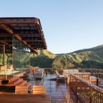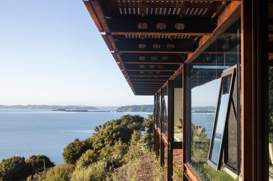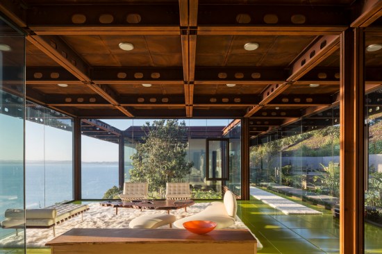 The house sits lightly on the land, with cantilevered floors and roofs, and it is made of recycled Cor-Ten steel, which stands up well to the region’s occasional cyclones and blends in with its surroundings. The firm, led by architect/entrepreneur David Hovey Jr., FAIA, centered the design on a proprietary structural system based on a three-dimensional grid, which it prefabricated in Arizona and then shipped to New Zealand in 11 shipping containers—like an Erector Set, according to the designers. The grid features a 7-foot-square horizontal module and a 1-foot-3-inch vertical module, as well as a 21-foot-square structural bay, which includes all the beams, columns, and other elements needed to plug in the modules on-site. The floor and ceiling horizontal modules are constructed from nine press-formed panels, which are bolted together in a three-by-three square. Windows, plumbing, wiring, ductwork, and stairs were all designed to conform to the grid, and to be assembled on-site.