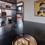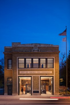Inside, durable and long-lasting materials such as blackened steel, walnut, and cork deliver a contemporary industrial aesthetic. The team preserved remnants of the building’s former life, including the Chicago Fire Department plaque and marble from the original showers which was used in the construction of a new kitchen. On the second floor, porthole windows flush with the floor now fill the original fireman’s pole openings.