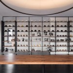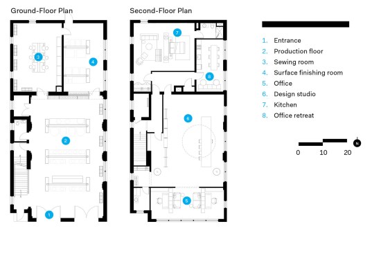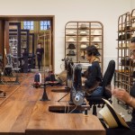 The architects began by dividing up the program: On the ground floor, they placed the manufacturing and display functions, an eye-catching spectacle visible through the wide glass front through which fire engines once passed; above, on the upper two levels, private offices and a creative atelier afford the employees room to think, meet, and experiment out of the public eye. As one might expect from a firm with SOM’s engineering pedigree, the entire scheme is a wonder of mechanical organization, with all the implements and power systems of the hatmakers’ trade (steam for pressing the fabric, compressed air for molding it, electrical tools for cutting) organized for optimal efficiency, as well as safety.