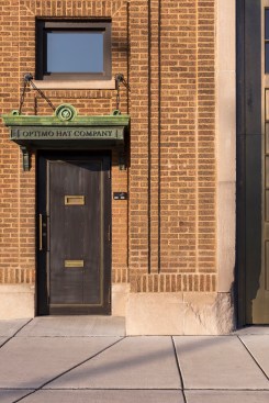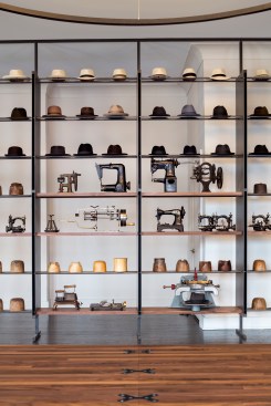 The space is as customized as the hats themselves: elegant steel casings frame task and ambient lighting above workstations; custom floor-to-ceiling shelving houses unique hat forms and molds; tailor-made rolling racks organize and mobilize hats for effortless access on the factory floor; modern and antique machinery were organized and finished uniformly in matte black; and restored glazed-brick walls wrap the daylit double-height space. Using early to mid-20th century techniques, each Optimo hat is formed and finished with materials like straw, fine furs, and rare ribbons to provide the superior product that defines the brand.