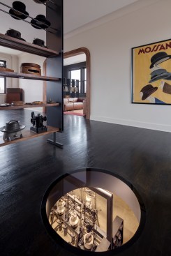 What truly impresses, however, is the material splendor and spatial elegance in which all this action unfolds. It is a romantic environment of richly patterned wood and exposed metal members with traces of the old building still visible, including the now-empty apertures for the fireman’s pole of old which punch through every floor, creating peekaboo portals between them. Intimate, nostalgic, and chic, the design could easily pass for the work of a small boutique interiors practice, rather than one of America’s best known and most venerable global architecture firms.