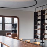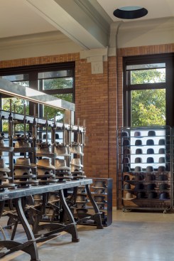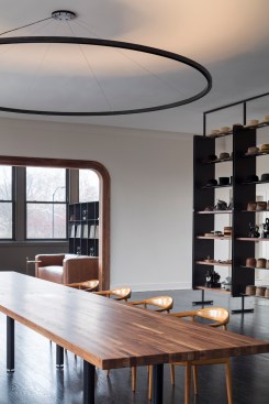 Adjacent to the atelier, a private office is delineated by open shelving designed in the same style as the industrial hat carts used on the production floor. Leather sofas, brass light fixtures, and dark walls create a comfortable ambience in the lounge area. Tucked discretely behind the south wall, private areas and full-scale working kitchen, finished with marble discovered in the original firehouse showers, serve as staging spaces for events and client visits.