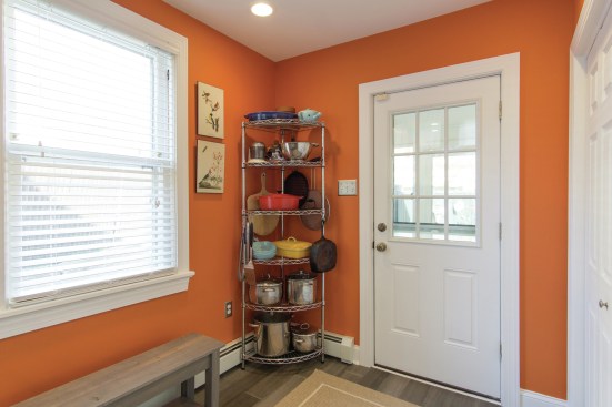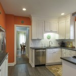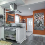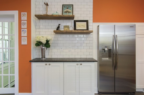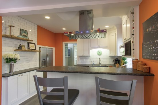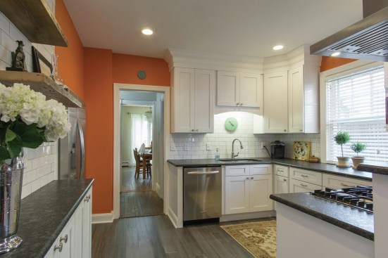 When a homeowner loves to cook but hates being in their kitchen, it really can cause some distress. The clients had some "nightmare-ish" pink-purple tiles, as they said and the space was depressing. Both of the clients wanted to be able to enjoy their kitchen and asked us to help them design an amazing space. Since the home was built in 1913, it still has many of the original charms and quirks. This includes original hardwood flooring that is uneven in certain spots and possible surprises behind the walls. Thankfully the kitchen had been remodeled in the past and the knob and tube wiring had already been replaced. We installed a beam when there was once a wall between the kitchen and butler's pantry. This allowed the homeowner's to put in a peninsula where the wall was but still have an open feel. Storage was a necessity so a custom cabinet was installed next to the refrigerator for pull out storage. The main challenge that the homeowner's had to overcome wasn't so much the design, but the color. At first, neither of them was excited about the idea of having an orange kitchen. With some encouragement from our designer and 3-D renderings to help seal the deal, they decided to give it a shot. They sorted through at least 10 different shades of orange – from "A Clockwork Orange" to Whoppers. Our designer wanted to make sure the color and design stayed within the architectural style of the home so they chose "Determined Orange" from Sherwin-Williams. With the help of accents like a stainless steel peg wall for pot and pan storage to a upgraded, leathered countertop finish, the home really speaks volumes. There is a balance between modern and old-fashioned. The homeowners' goal was to have a space where they enjoyed spending time and now they can't wait to get up in the morning, make a cup of coffee, and just smile in their beautiful new space.