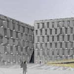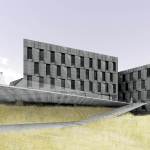 Since Ordos is located in a region of China with extreme temperature variations, environmental performance of the campus was crucial. An insulation value of R40 will be achieved in a façade of locally quarried stone slabs with operable triple-glazed windows, recessed to minimize solar gain. Offices are to be heated and cooled by radiant hydronic ceiling panels served by a geothermal loop. Stormwater runoff will be stored on site for nonpotable uses, including the filling of a reflecting pool to temper summer heat on the plaza.
