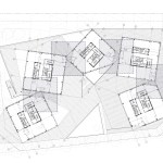 NADAAA’s solution houses the program in five cubic volumes, rotated at odd angles and connected variously at their corners or along their flanks. The resulting “necklace” of construction defines a shared plaza. The joining of modules is achieved with angular slices at their corners that can yield sheltered entries, glazed lobbies, or canted skylights for upper levels.