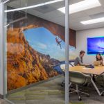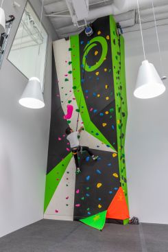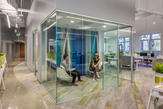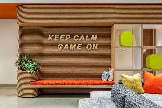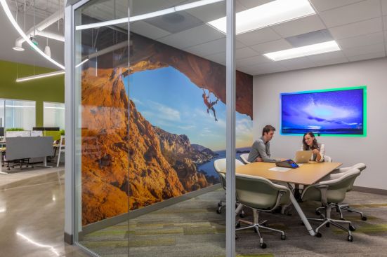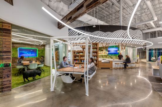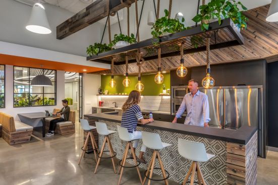 To promote health and wellness, Orgain introduced a 30-foot rock climbing wall and state-of-the-art fitness center complete with cardio and weight equipment for its team of nearly 100 employees. A kitchen for social gatherings is outfitted with a built-in custom coffee bar, and roll-up garage doors open the space up to the outdoors to reveal a Zen garden, outdoor kitchen, barbeque, water feature, putting green and diverse seating options. A test kitchen, used to experiment new flavors of Orgain products, incorporates swinging seats on an aircraft table to provide a dynamic and creative workspace. A game lounge with a ping-pong table, arcade system, large dual function tic-tac-toe furniture pieces, chalk wall art and LED neon sign with an inspirational quote from Orgain’s CEO rounds out the company’s purpose-built environment and serves as a destination for human connection.