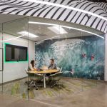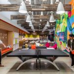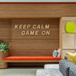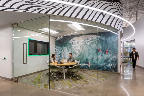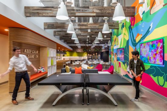 The interior architecture of the office draws from the swooping “O” in the Orgain logo, a halo that represents health and wellness, and seamlessly integrates organic elements and pops of color to bring Orgain’s brand palette to life through the design. The flexible workplace incorporates myriad sustainable features, from wood elements to create texture, to biophilia to bring in natural light and promote access to the outdoors. Colorful murals are prominently placed in strategic locations throughout the space, one of which includes a wave-like gesture painted by muralist Brendan “the Blob” Monroe that is inspired by how Orgain protein drinks are mixed in a blender. Another vibrant and colorful mural by artist Xoana Herrera serves as the backdrop in a game room and encourages staff to have fun in all that they do.