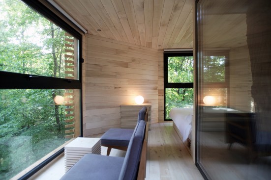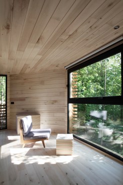 A cosy, bright and intimate atmosphere fills the space thanks to the large windows. The inner lining of the wall is made out of poplar, a light and clear wood essence with a subtle scent. The smooth, flat interior walls are mat- ched by the custom-made furniture surfaces, worked with fine horizontal slats, in a simple game of geometric volumes. Around the patio the living spaces develop in succession; from the entrance to the living area and the sleeping area, till a narrow corridor with three sliding doors that give access respectively to a dressing room, a well equipped bathroom and a technical closet. Each one of the living spaces faces the large windows overlooking the forest, offering a mid-air view on the foliage of the centennian oaks of the domain.