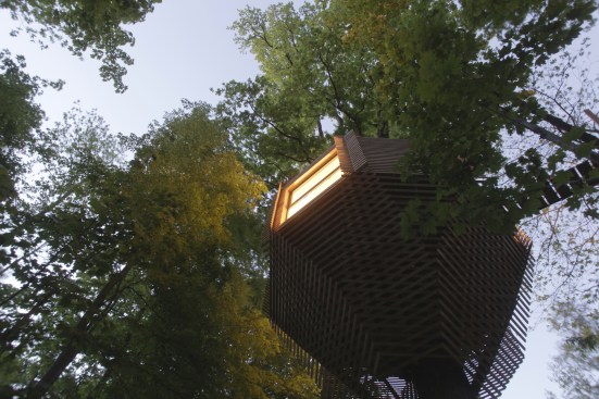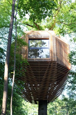 As its customers often wanted to define it, ORIGIN is an exceptional cabin, a unique and tailor-made project. A hundred- year-old oak, one of the most beautiful and tall of the domain of the Château de Raray, was the starting point for the whole reflection: how to sublimate the tree? Creating around it a tailored wooden-dress. Meeting point between poetry and carpentry mastery, ORIGIN tree house discreetly stands out among the centenarian oaks of the Château de Raray forest, as if it had always been part of the scenery. Majestic and elegant, it integrates and completes an already impressive landscape, sublimating it by offering a shelter.